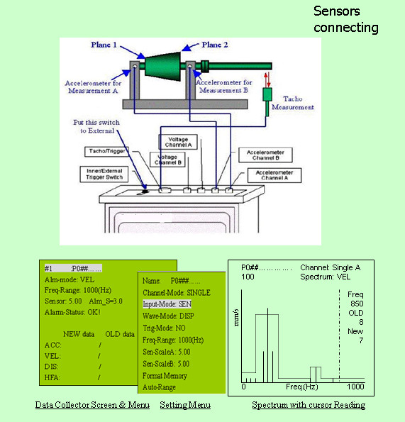 • Full featured 1 and 2-planes field balancing (10 sets balancing data storage; balancing process clarified by vector graph; trial weight estimation; can remain or remove trial after balancing; balancing weight decomposition)